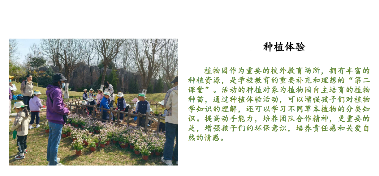 活动特色介绍:11类专类园,4000+种植物,种植体验;与自然亲密接触,此次研学活动学员栽种的植物将被纳入市民花海项目向市民公开展览。